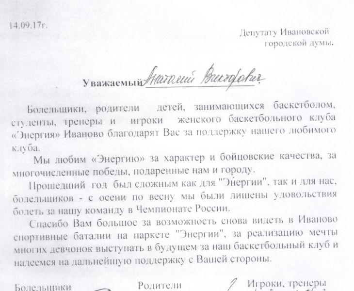 Благодарность депутату Ивановской городской Думы А.В. Омехину