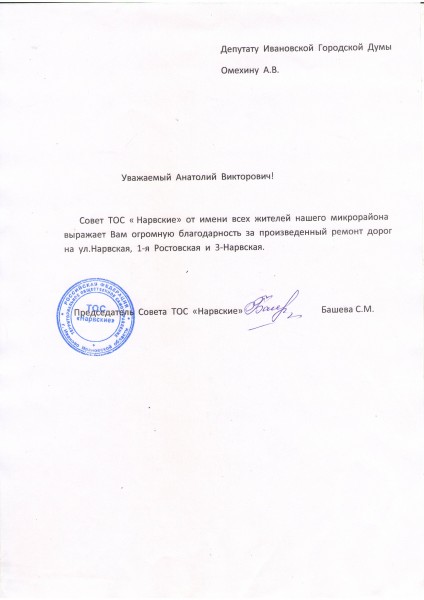 Благодарность депутату Ивановской городской Думы А.В. Омехину от Совета ТОС «Нарвские»
