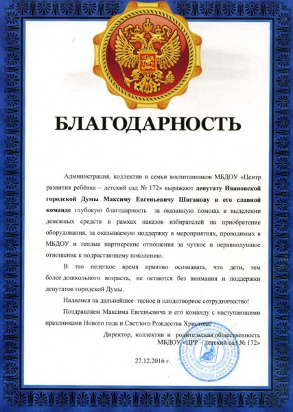 Благодарность депутату городской Думы от коллектива и семей воспитанников детского сада № 172.