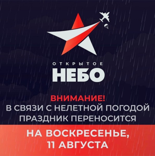 По информации Правительства Ивановской области, в связи с погодными условиями оргкомитетом областного военно-патриотического праздника «Открытое небо» принято решение о переносе мероприятия на воскресенье 11 августа. Летная и концертная программа праздника остается без изменений. Начало в 10.00 часов.